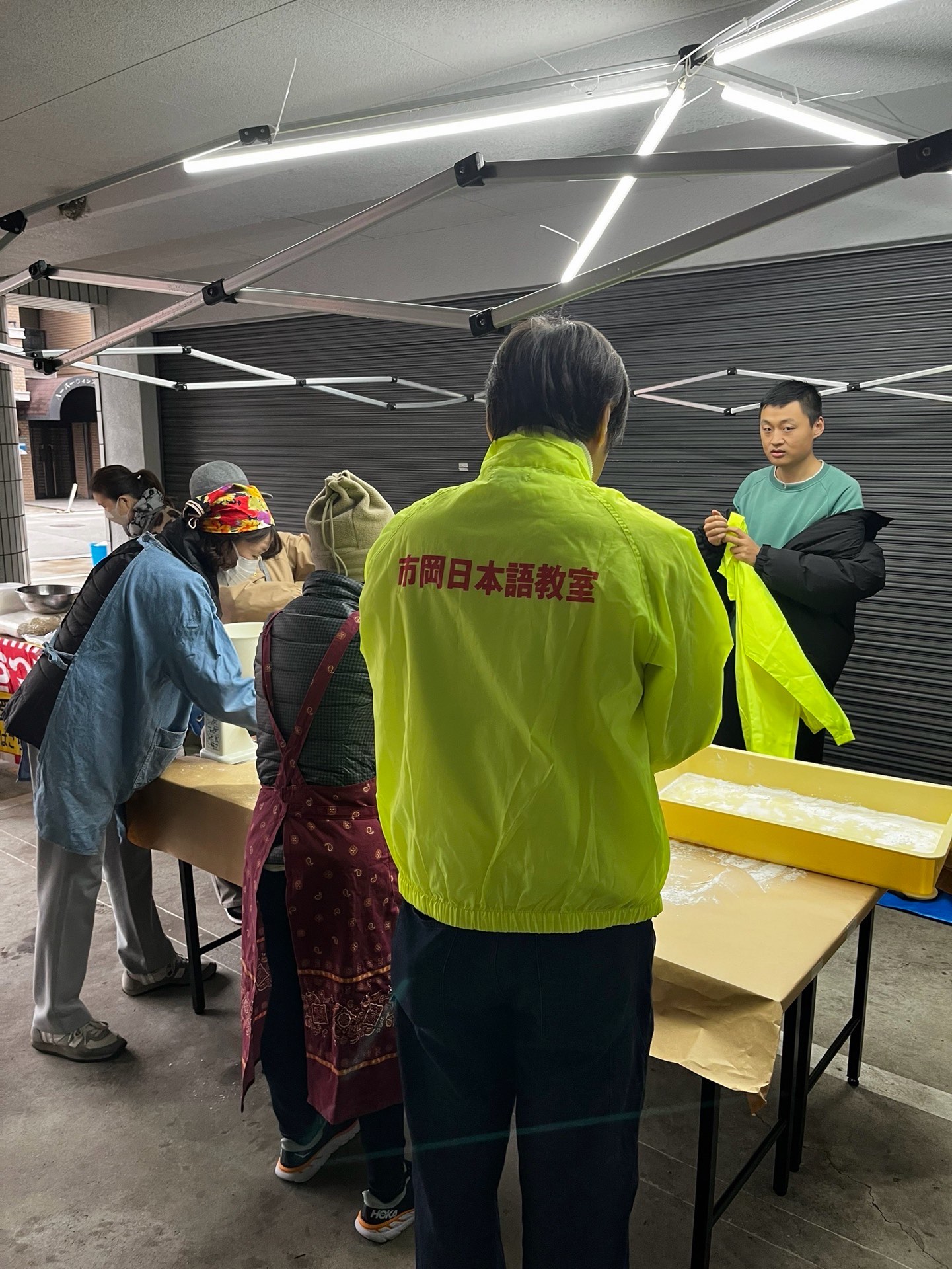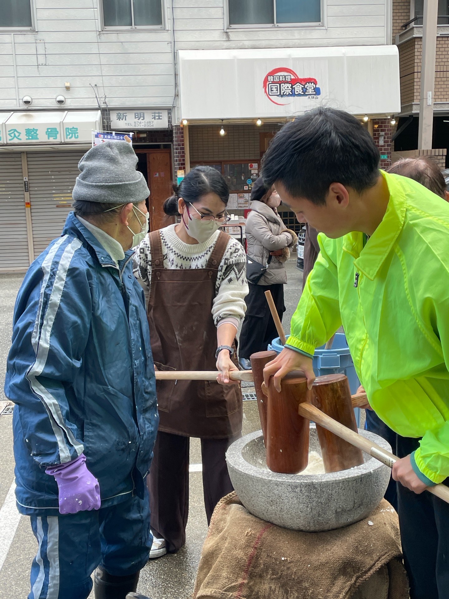 天保山商店会さんとは長いお付き合いになりました。餅つき大会では、市岡日本語教室のメンバーをスタッフとして待っていてくれています。学習者さんにとって貴重な経験ができる機会をいただけて、とても有難いです。