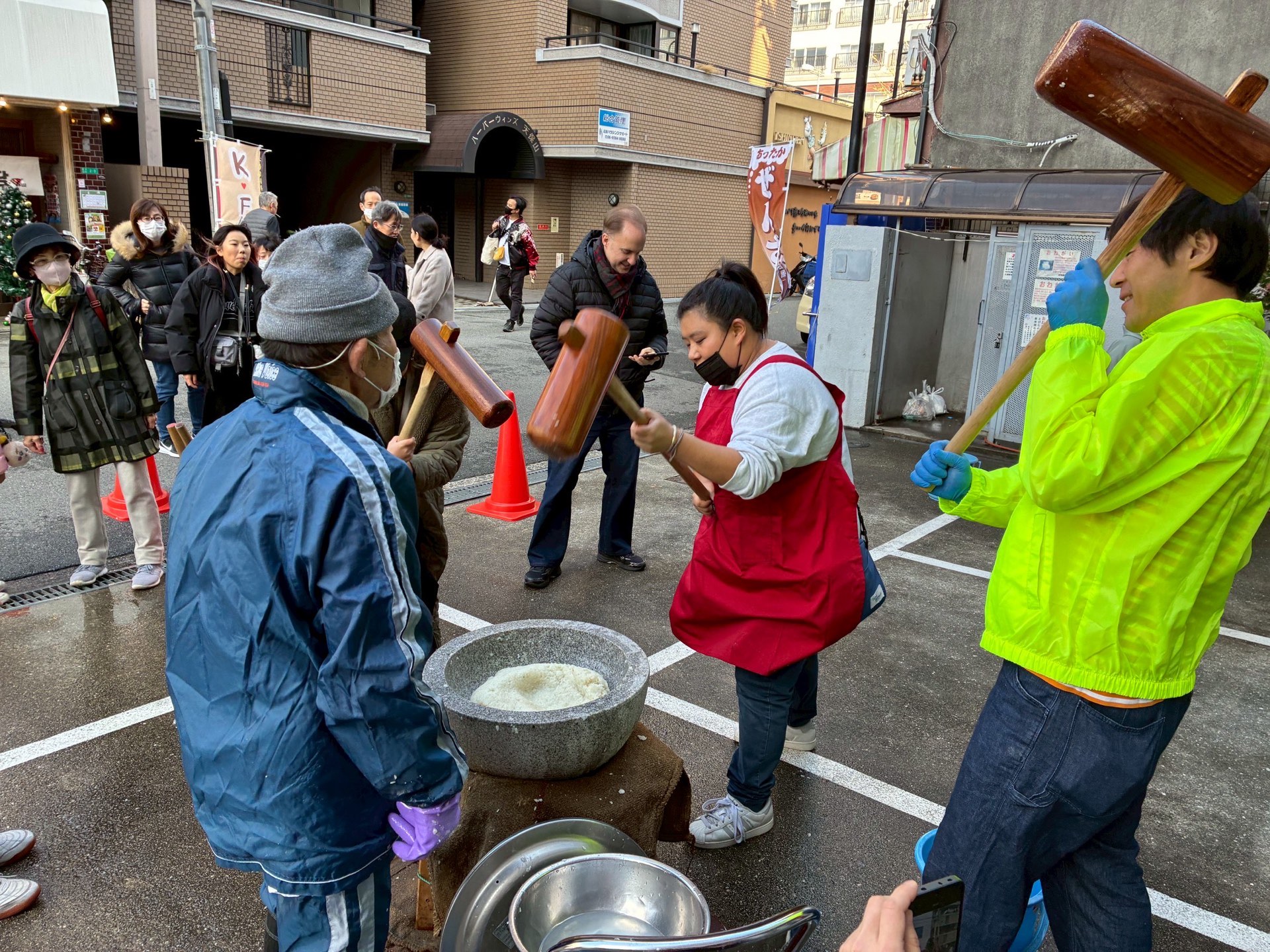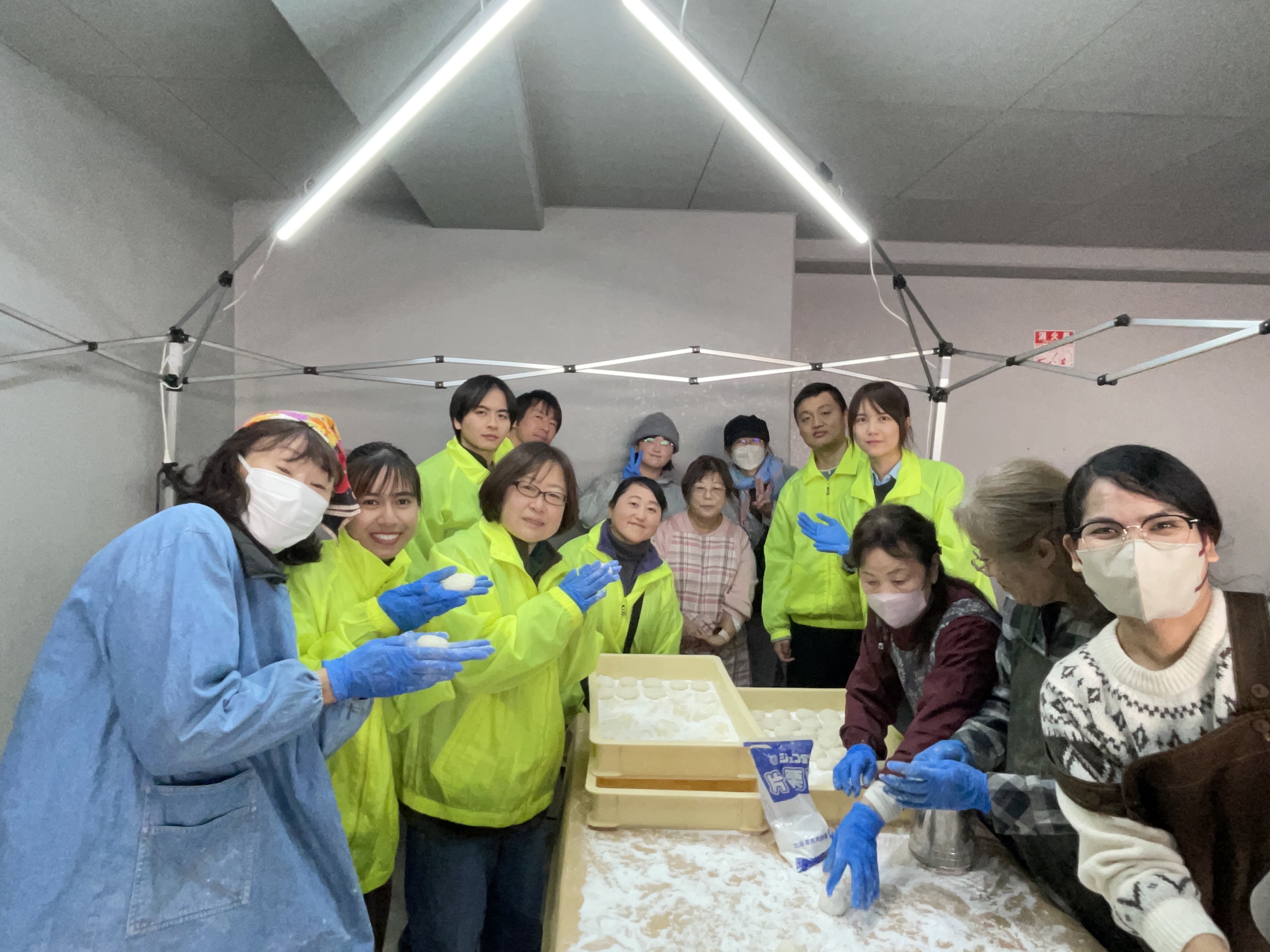天保山商店会の餅つき大会に参加しました。深夜から降り出した雨も朝には止み、順調にスタート。学習者さん、ボランティアさんもどんどん来て、ジャンバーやエプロンをつけてやる気満々。